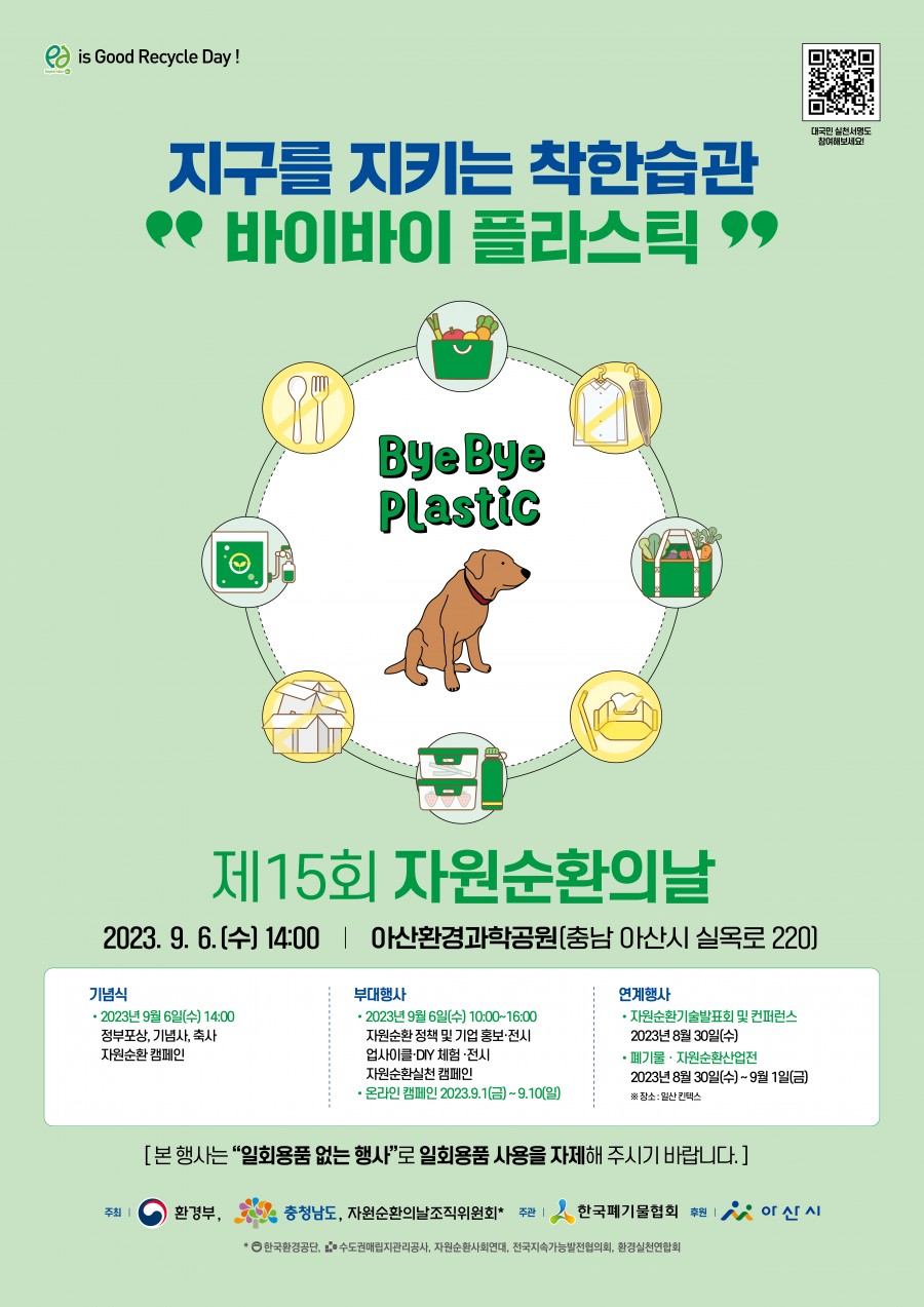 '제15회 자원순환의 날 행사'는 불필요한 플라스틱 소비는 줄이고 착한 소비 실천을 장려하고자 "지구를 지키는 착한 습관, 바이바이 플라스틱"을 주제로 진행됩니다.